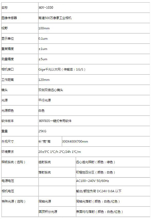 一鍵式測量儀HOV-1030 1、自動(dòng)圖像配準(zhǔn)功能,無需定位工件,無需夾具,產(chǎn)品隨便擺放,實(shí)現(xiàn)自動(dòng)識(shí)別測量 2、圖像傳感器采用德國巴斯勒高清500萬像素CCD 使得成像清晰、畫質(zhì)細(xì)膩; 3、采用意大利OPTO雙側(cè)遠(yuǎn)心鏡頭 4、采用HOVKOX技術(shù)生產(chǎn)的儀器控制器(分為內(nèi)置和外置兩款), 5、整機(jī)內(nèi)部骨架及工作臺(tái)采用航空鋁型材 6、采用HOVKOX級(jí)一鍵式測量軟件